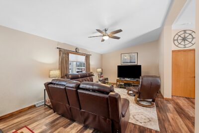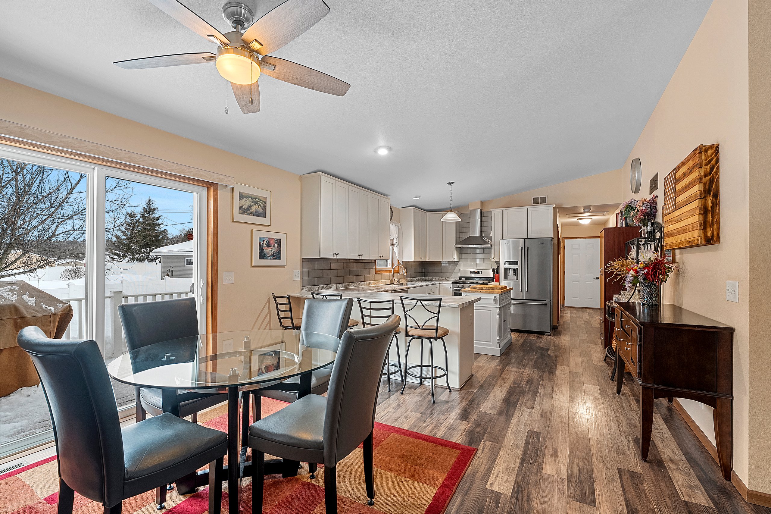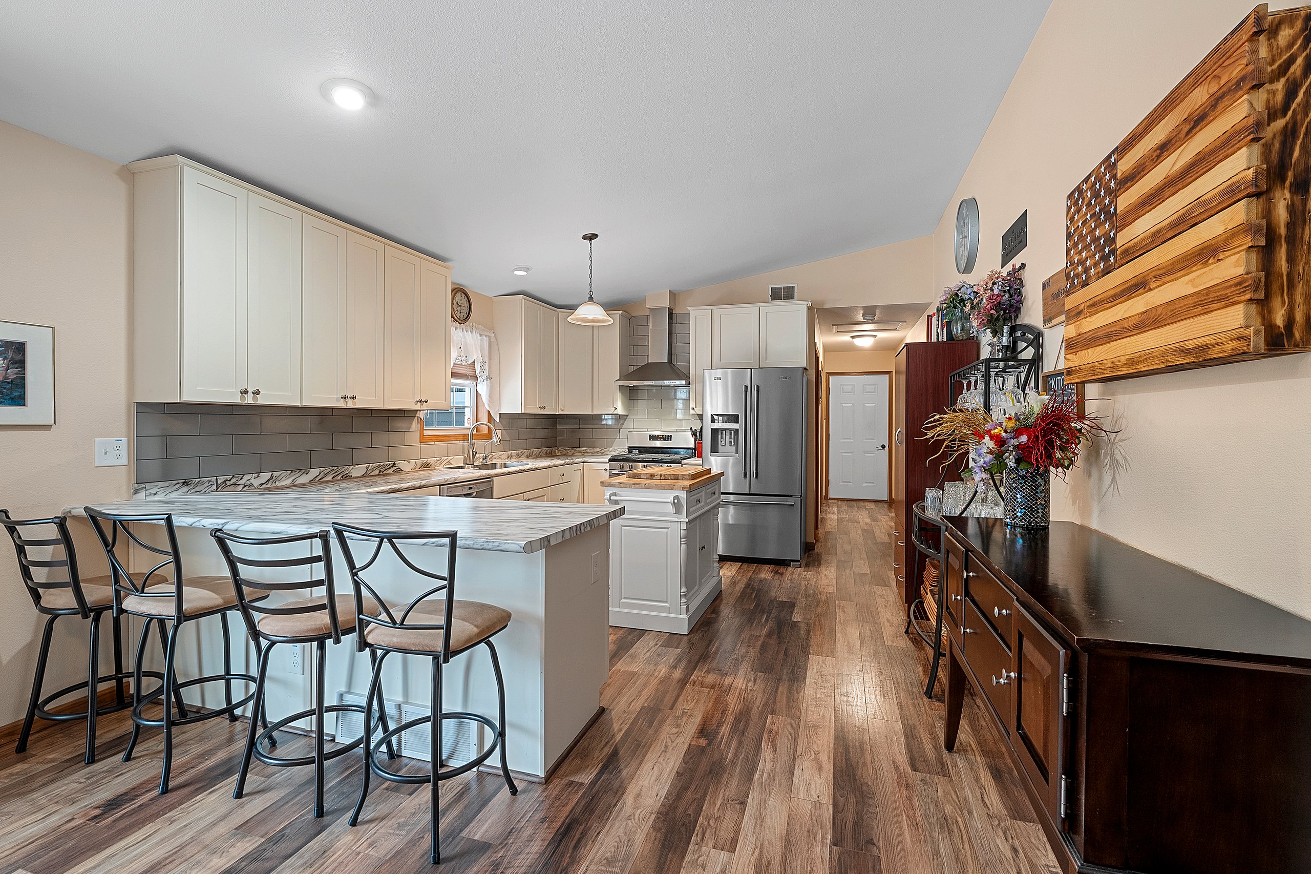 Step inside and fall in love with the open floor plan, vaulted ceilings, and natural daylight pouring into every room. The kitchen is a dream with custom floor-to-ceiling cabinetry, tiled backsplash, center island, and snack bar (stools included). The dining area leads to an impressive 8’ x 28’ deck, ideal for entertaining or simply enjoying a quiet evening.