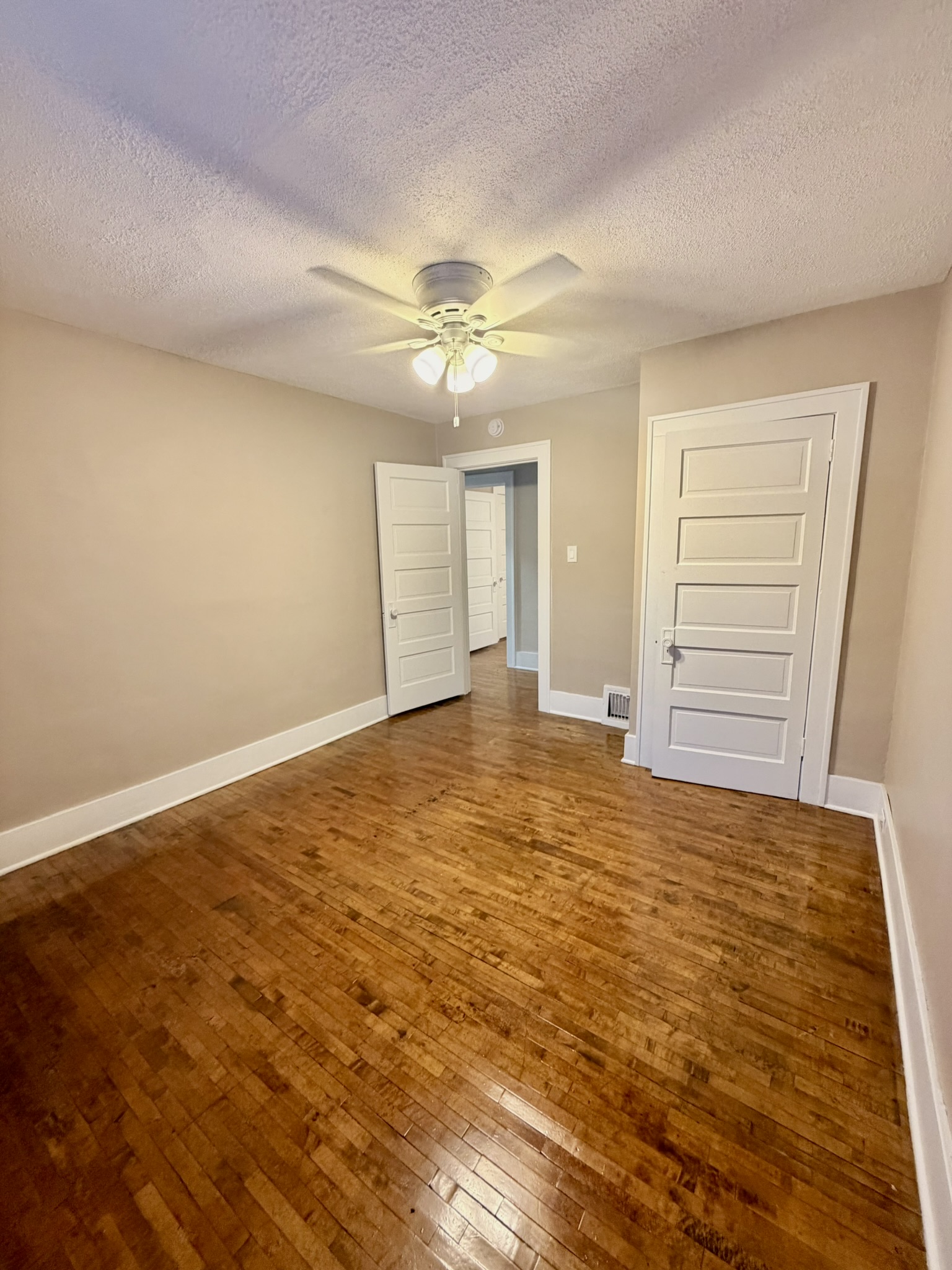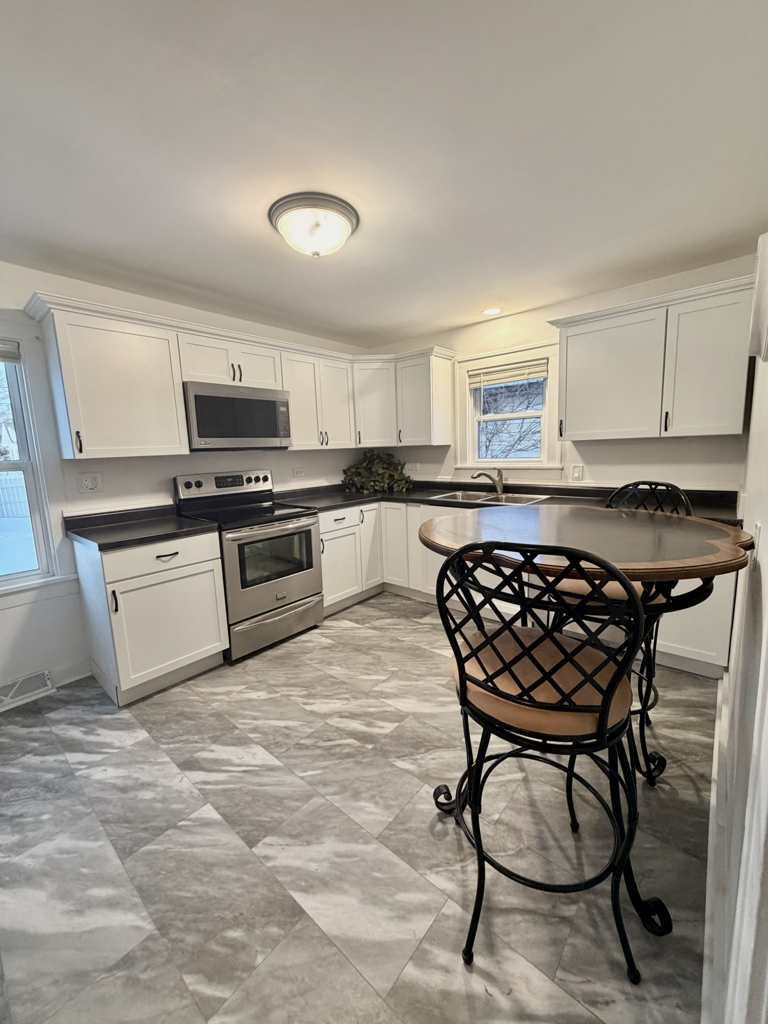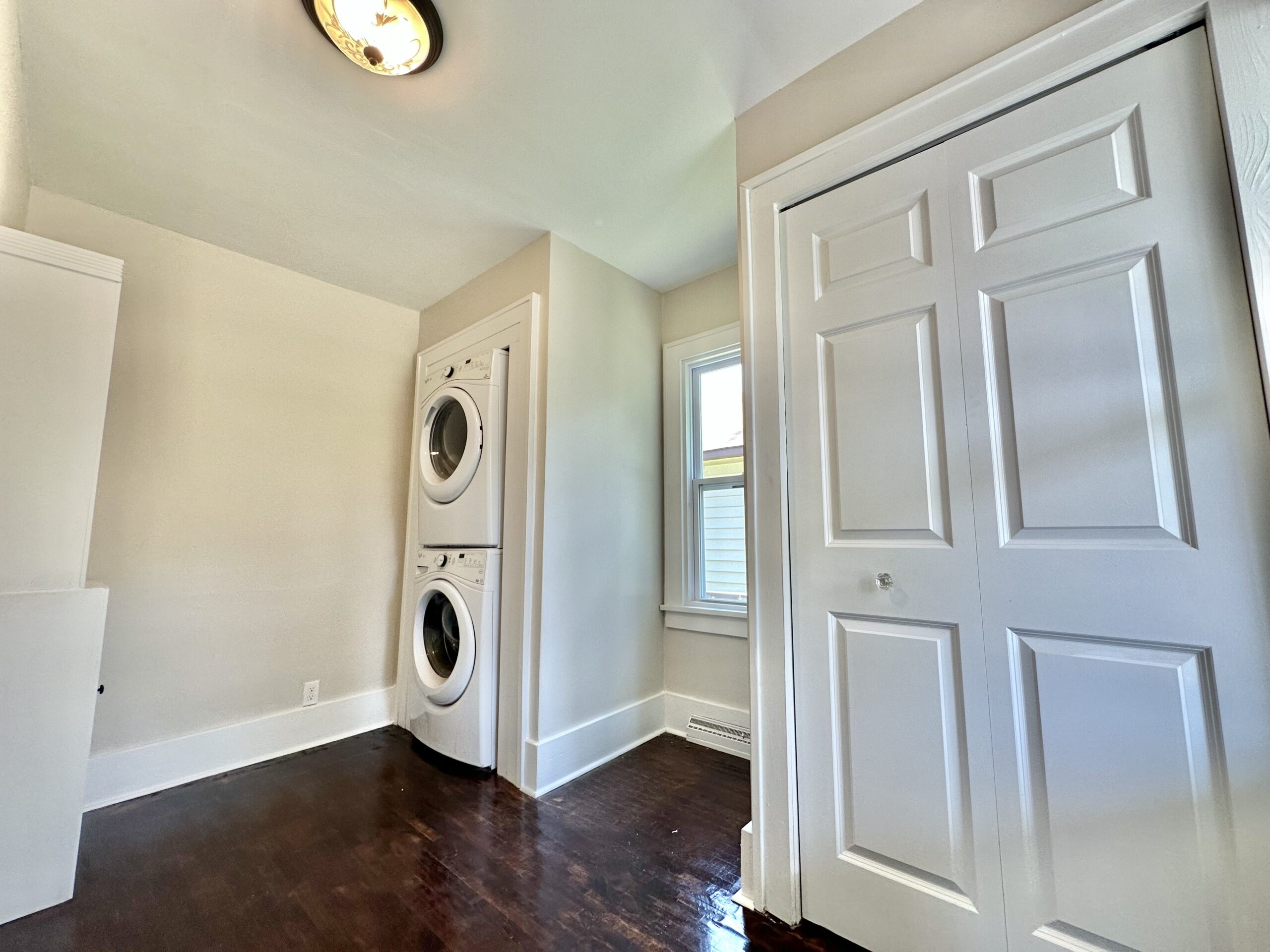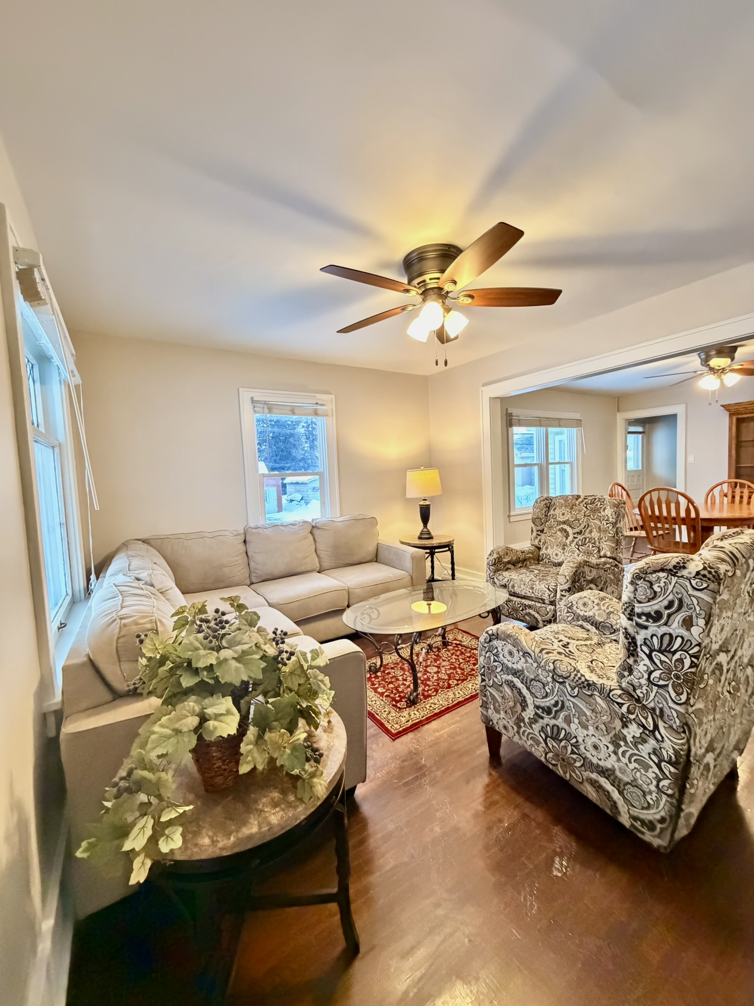 conveniences. Located on a picturesque tree-lined street near parks, schools, and shopping, this home is ready for you to view, live, and enjoy. The moment you walk in, you'll be greeted by gleaming restored hardwood floors that shine with their original beauty. The spacious living room features large picture windows and elegant leaded glass transoms, filling the space with natural light and vintage charm. Off the front of the home, a cozy sitting room provides the perfect spot for reading or relaxing and offers access to the serene backyard. The main floor boasts a stunning, kitchen with newly installed cabinetry, appliances, and countertops-ideal for cooking and gathering. A beautifully updated full bathroom features classic white subway tile and modern fixtures. Convenient first-floor laundry adds ease to your daily routine. Upstairs, you'll find four generously sized bedrooms, including large closets and even walk-ins. The