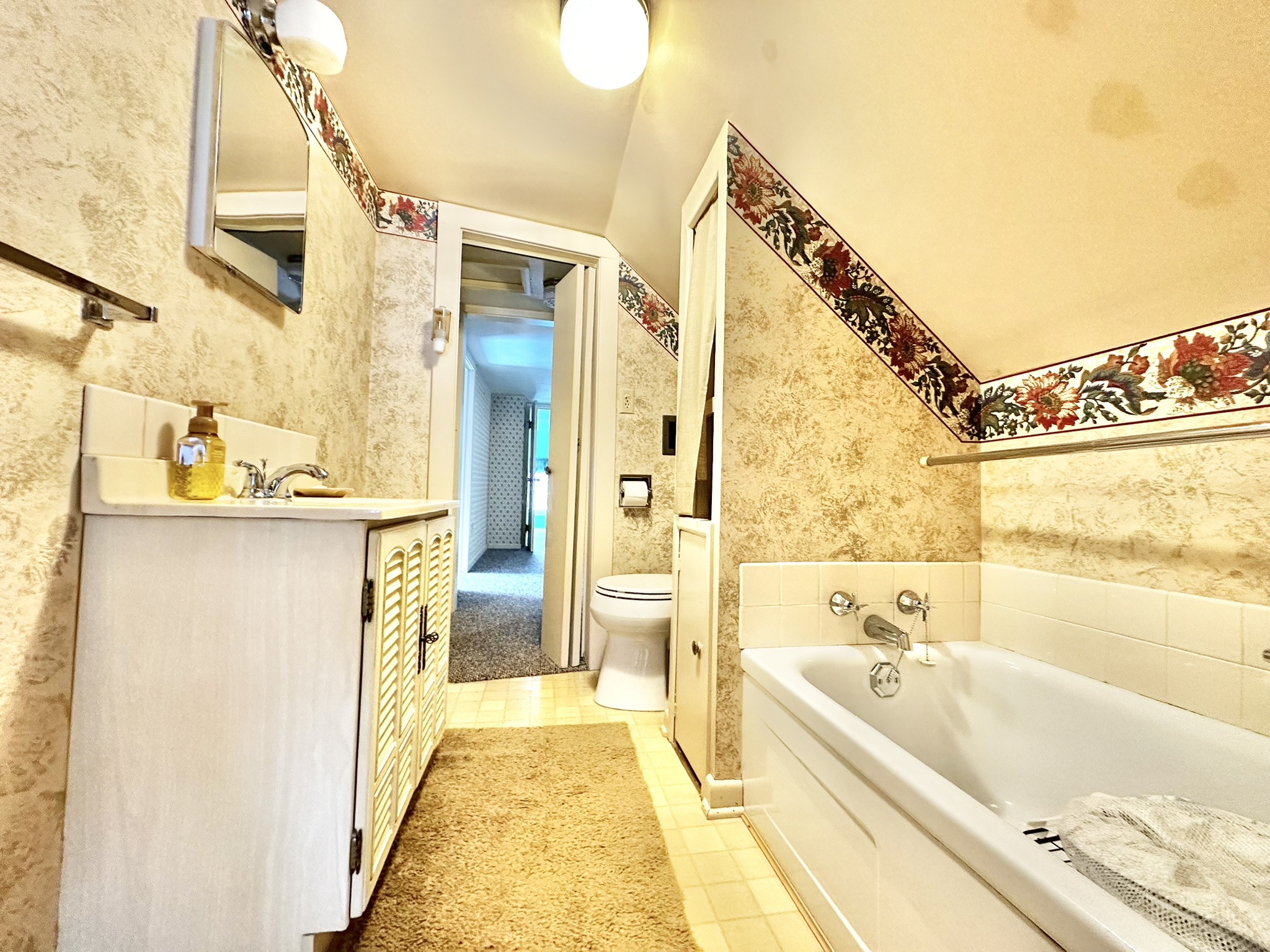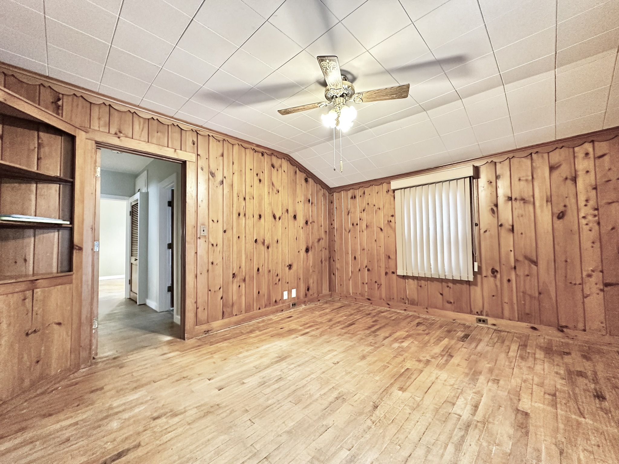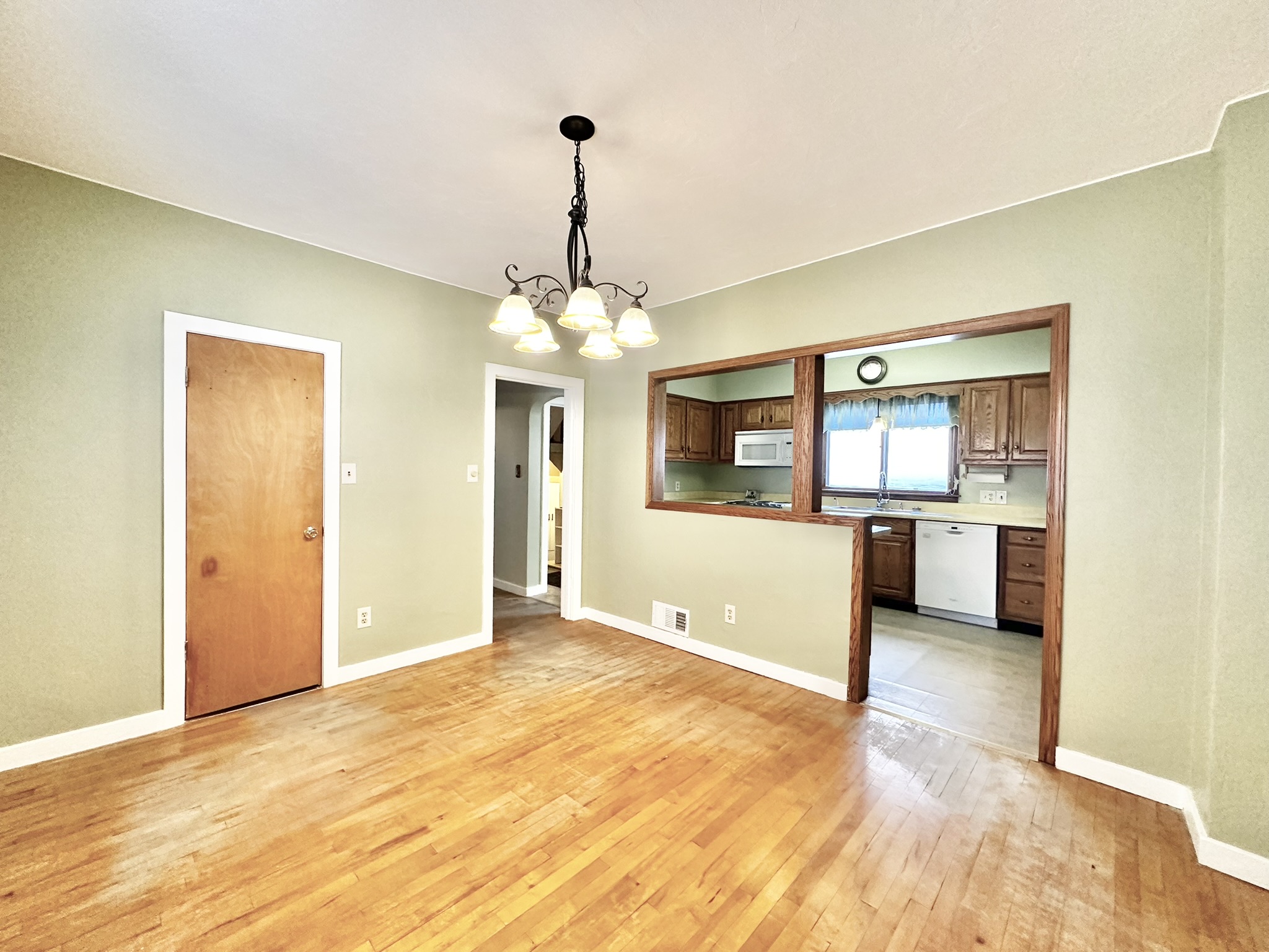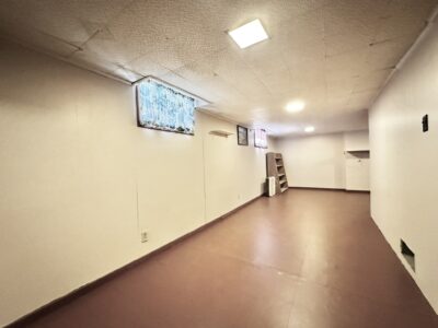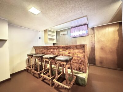 enjoying peaceful mornings or entertaining guests. The living room boasts gorgeous hardwood floors, a bright bay window, and timeless character throughout. A functional galley-style kitchen opens to the dining room, which includes a large closet for added storage. A unique dual staircase leads you to the upper level, where one side brings you directly to the master bedroom with a convenient walk-through full bath, while the second staircase brings you to three additional bedrooms, each offering generous closet space. The full basement provides fantastic bonus space with a custom-built bar and stools, a laundry area and a small workshop ideal for woodworking