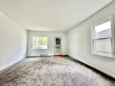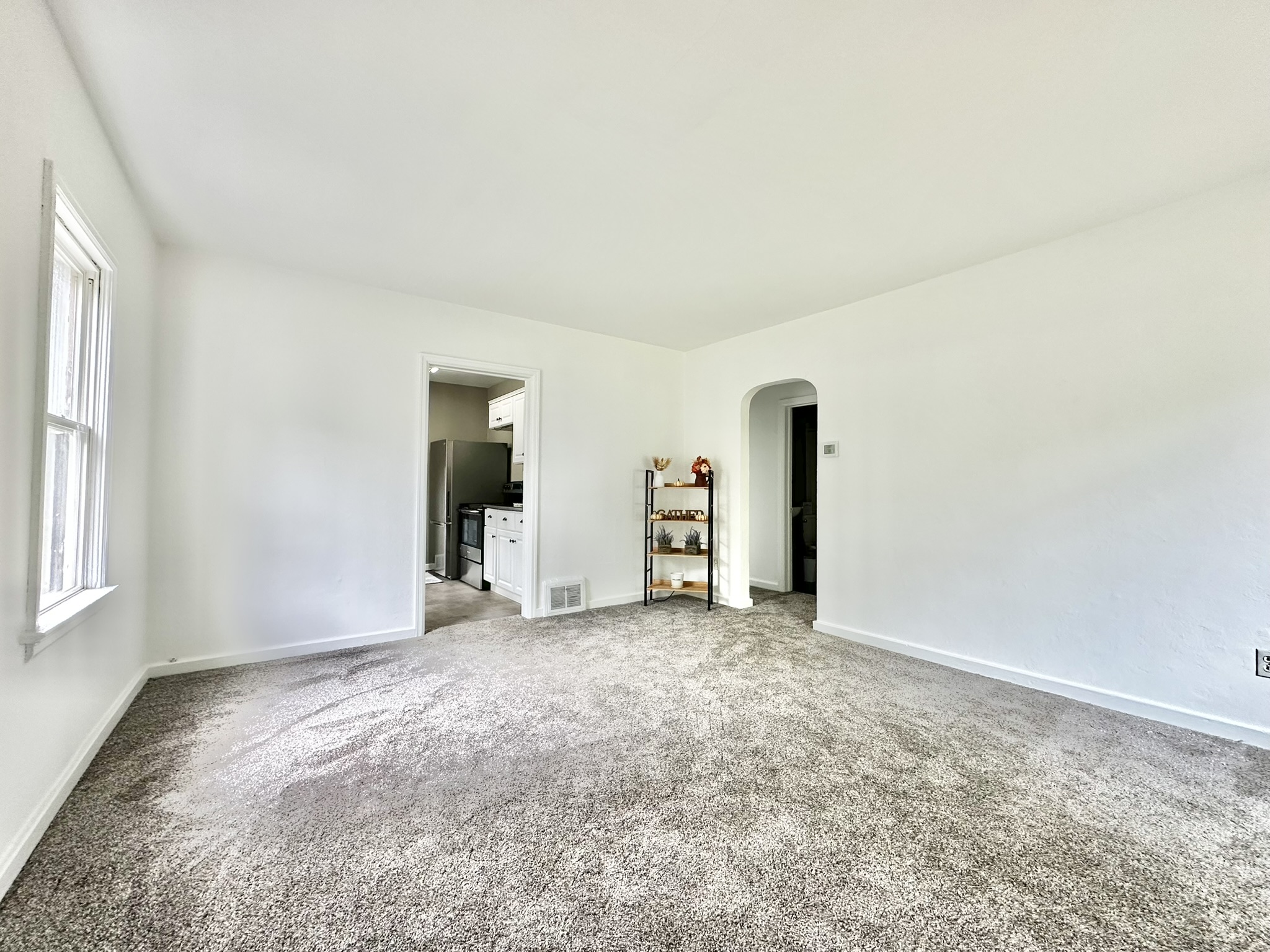 into a bright and inviting living room, filled with natural light from large windows. The freshly painted basement features higher ceilings,